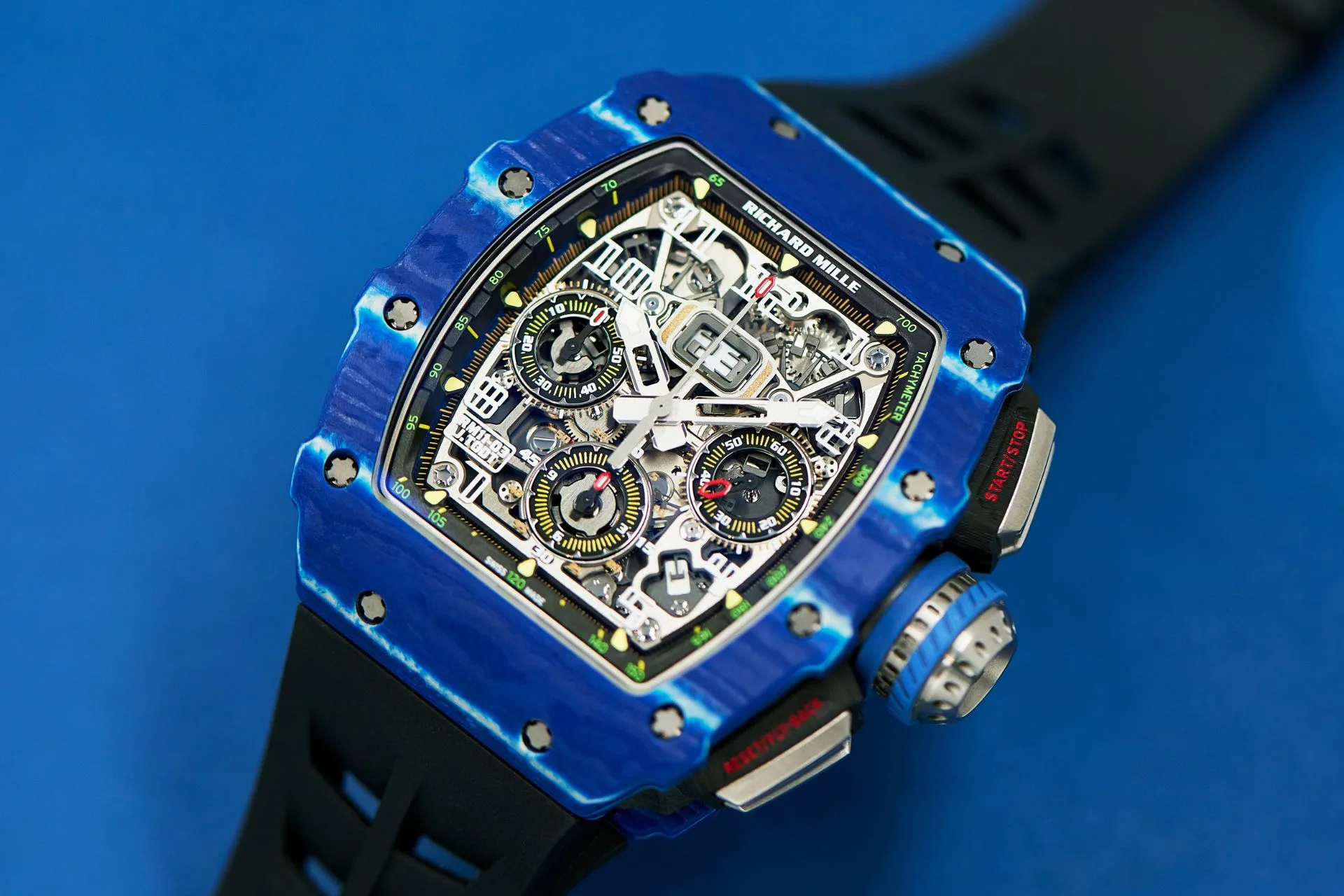 Split-seconds, but make it daily. The RM 65-01 Black Carbon TPT is a high-beat rattrapante with a complication-dense dial that somehow remains usable. The case hugs neatly; Carbon TPT keeps weight down; the colour-coded pushers and hands guide you through the functions without guesswork. This is the “mechanical flagship” Mille you actually want to wear.