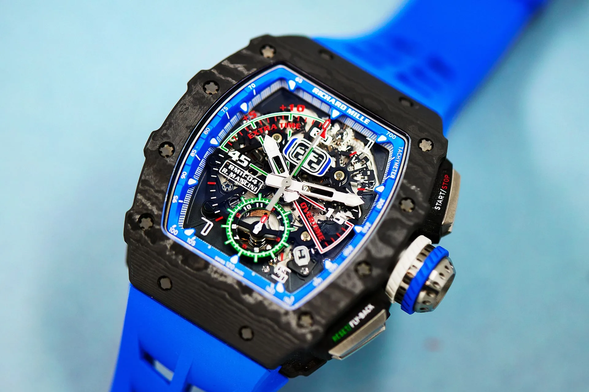The RM 11-04 Roberto Mancini takes the RM 11 canvas and grafts on a match timer tuned for a football manager’s brain. Function-forward, yes—but it still reads clean thanks to color-coded scales and the familiar skeletonised depth. The carbon case softens the visual mass and keeps the watch planted but comfortable throughout the day.